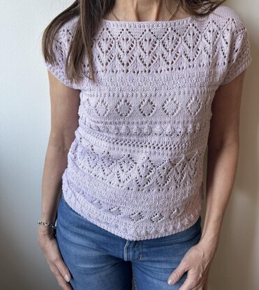 Towards the end of each winter, I start dreaming of sun, bees, blossoms and I always try to design at least one new top to wear when the sunny days arrive. The pattern is tested by a group of talented knitters. They all found the top delightful and fun to work.