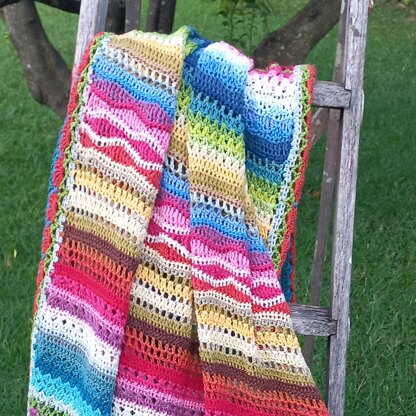 Featuring a variety of simple crochet stitches worked in stripes, this blanket is a fantastic stash-busting project or the perfect opportunity to create a planned, colorful afghan.