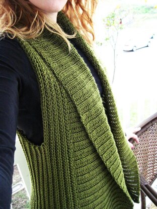 Belinda is a ribbed vest featuring a graceful shawl neckline that extends all the way down the body. The body of Belinda is crocheted vertically from side to side in one piece. After seaming the shoulders, the collar is worked directly onto the finished vest. Belinda is offered in five sizes, making it the perfect multi-season layering piece to flatter many figures.