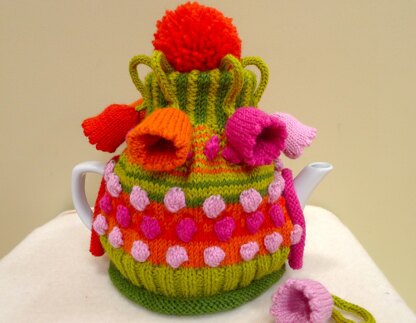 This is a truly striking tea cosy. It is a bright mix of Summer colours. A giant pom pom tops the ribbed dome and this is surrounded by pretty bell flowers attached to “I” cord stalks. The sides are embellished with bobbles in two shades of pink, and a variety of stripes and ribbed sections make this a really interesting cosy to knit. Surprisingly this cosy is knitted in one piece from the top down and then splits onto straight needles to work the sides. Once these have been completed everything is joined back together to work the bottom section. Is your mind in a whirl? Never mind. Just take it a step at a time and it will all work out just beautifully and you will end up with a tea cosy which makes you smile every time you look at it.