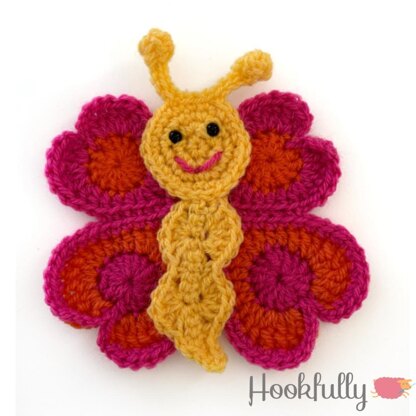 **Large butterfly Applique** This crochet pattern will help you create a big, flat butterfly applique for kids. The butterfly has a round smiley face with antennae and large heart shaped wings.