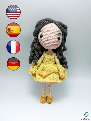 Belle is an amigurumi doll with interchangeable clothes. Hands and legs are bendable.