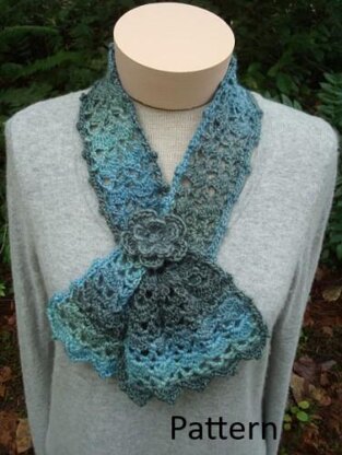 This stunning little scarf features an easy shell stitch pattern that increases to a ruffle on each end. The pattern creates a keyhole opening for fastening. Instructions for a lovely crocheted flower that is attached with a pin back are included in the pattern PDF.