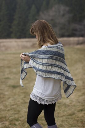 Playful stripes befriend simplistic, romantic lacework to help make this asymmetrical shawl a perfect wardrobe staple.