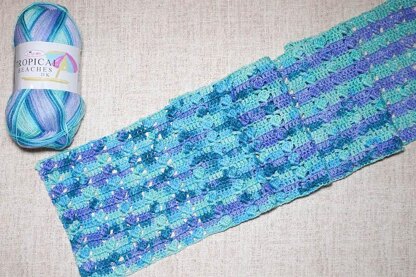 MaterialsKing Cole Tropical Beaches DK yarn (70% acrylic/30% polyamide (nylon), 7 oz/200 g, 557 yd/510 m) – 1 skein in 4850 Patara Beach, or approximately 530 yd (484.5 m) in any light weight, self-striping yarn.