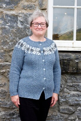 The cardigan is knitted in the round, with a steek at the centre front. Between the start of the arm opening and the start of the yoke 2 steeks are added to continue working in the round. The back neck is heightened by working extra rows between arm opening and the start of the yoke. Step by step instructions are included. There are no short rows.