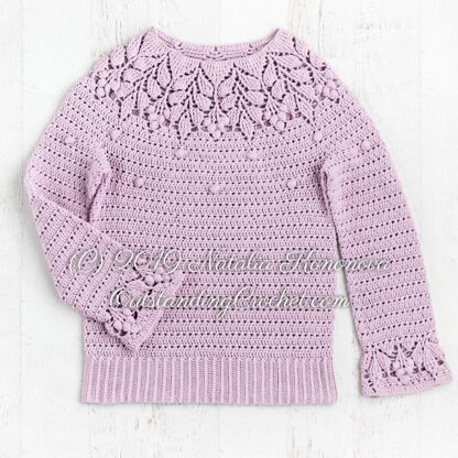 Written instructions are accompanied by schematics, some step pictures, video-tutorial for a bottom band, and 3 crochet graphs / charts / diagrams: for body stitch, yoke and sleeve edging.