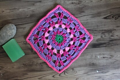 Berrliee Square A large, bright square motif. Perfect for stash busting or using up oddments of yarn. ‘Berrilee’ is names after a suburb in Northern Sydney, on the western shore of Berowra. This pattern uses some intermediate stitches, with several cluster variations, with abbreviations on stitch explanations given.