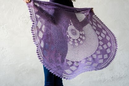 I am addicted to designing and knitting pi shawls. This one alternates between very lacy honeycomb mesh and geometric patterns on a solid stockinette stitch background. All of the openwork is made with double yarn-overs for an extra airy feel. In fingering-weight alpaca yarn, this shawl is warm and cozy, even with so much lace.