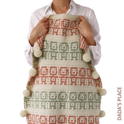 2 skeins of color 16 (green) or approximately 65 g 2 skeins of color 20 (peach pink) or approximately 65 g 5 skeins of color 01 (off white) for the blanket + 1 skein for PomPoms