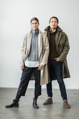 The dickie is worked flat bottom-up in two pieces. They are sewn together at the shoulders. Stitches are picked up to knit the turtleneck in the round. The geometric pattern is formed by half twisted 1x1 rib in combination with left and right twists and 2-st I-Cord edges. Wrap & Turn Short-Row shaping is used to shape the shoulders.