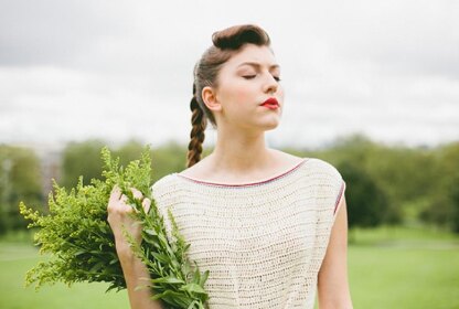 Worked in one piece, bottom up, the t-shirt is then split in to back and front for the armholes and neck shaping. Short sleeves are added on at the end and surface slip stitch crochet is used to add stripe detailing.