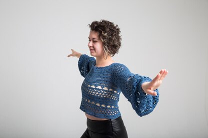 This is a crochet blouse pattern for English speaking users. Model measurements (size M): 163 cm height, 64 kg weight, hips 38.5 in / 98 cm, chest 37 in / 94 cm.