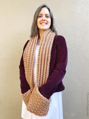 This knit pattern is a beginner friendly scarf pattern. The scarf features basketweave pockets, and a ribbing stitch that is uber cuddly.