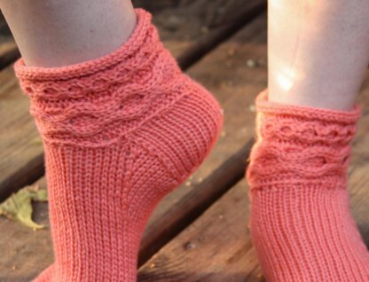 These slippers begin with a cabled cuff, worked sideways. The cuff can either be seamed or grafted, depending on how you choose to cast on. Then stitches are picked up for the heel flap. After the heel is turned, stitches are picked up from the rest of the cuff for the instep, and gusset are worked. Then it's straight down to the toes, which are grafted together with Kitchener stitch. Applied i-cord finishes the tops.