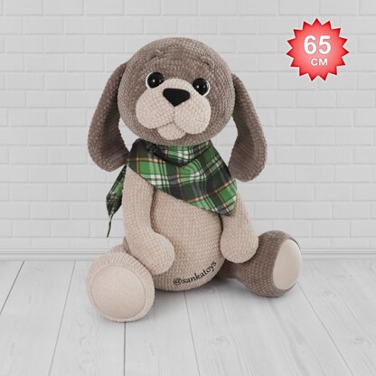 Velvet yarn YarnArt Dolce. Colors: beige (#771, with my density it took 4 skeins, ~5cm for one sc) and brown (#754, with my density it took a little less than 4 skeins). Smooth thick white yarn (or cord) to embroider a semicircle beside the eyes.