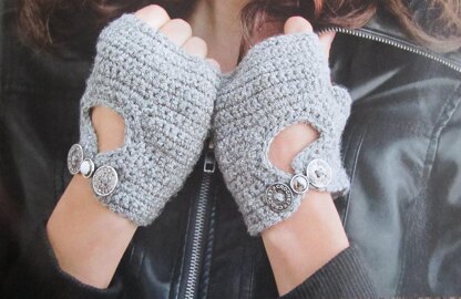 Work this pair of fun, tough-girl mitts in a goes-with-anything shade of grey wool. You can use your free metal clasps to add stylish detail. They're pretty and practical too.