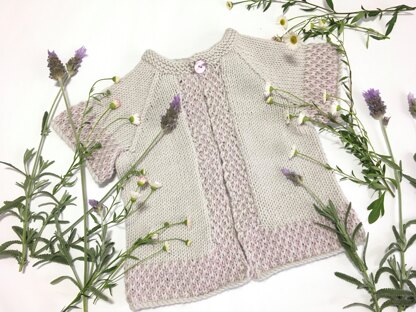 Bindi is a cute little raglan-sleeved baby cardigan that features two-coloured tuck stitch borders. Two versions of the pattern are included, one with long sleeves and one with short sleeves. Both sleeve lengths include tuck stitch patterned edges.