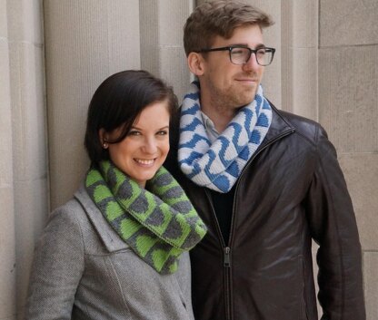 This deceptively simple pattern is a great introduction to double-knitting for those who haven’t tried it before. Each repeat of the pattern has only 2 color changes, so there’s very little to keep track of as you work. The color changes move subtly to trace a pattern of sine waves running up the cowl’s sides. Each side has the same motif, but the opposite color is more prominent on the other side.
