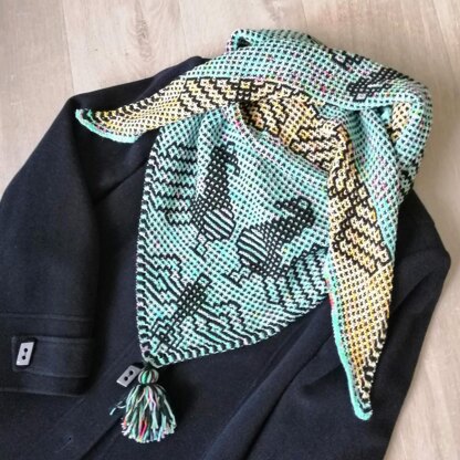 The shawl features an original bold graphic pattern inspired by Peruvian textiles, created specially for this design. The shawl is knitted from bottom up in mosaic garter stitch, casting on five stitches and increasing at the beginning and end of each right side row.