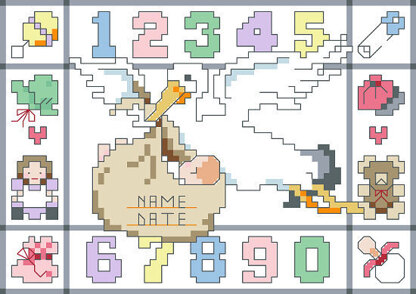 Designed by: Jorja Hernandez. The Stork brings a new baby in this charming traditional birth announcement that works up quick in big stitch. This adorable baby design by Jorja Hernandez is 12w” x 8 1/2h” on 6 count fabric. Perfect when framed or finished as a pillow. So that’s where babies come from?\n