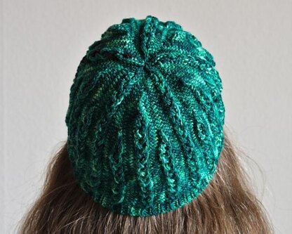 The beanie is worked sideways, in one piece, and is seamed at the end. Shaping is done by short rows, even within the braids.