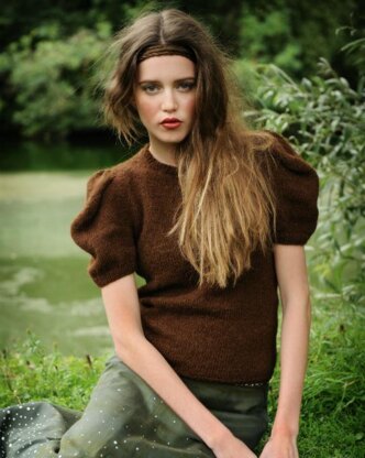 Bjelle Top is knitted flat in 4 pieces, front, back and sleeves. Rib edge for neckline is picked up and knitted after sewing up. The 3D effect of the puff sleeves is created using a decreasing technique.