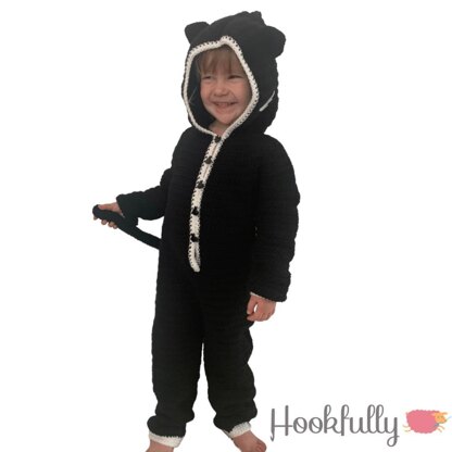 This crochet pattern is for a black cat kids onesie pyjamas. The outfit is perfect as a children’s Halloween costume or nightwear. The children’s clothes are suitable for children aged 2-10 years and includes 8 sizes which are listed below. The kids sleep suit is crocheted in one piece and the cat decorations are made separately and are sewn on at the end. The hooded onesie buttons up the front and has cat themed decorations including a ears, whiskers and tail. The onesie can be used as pyjamas, Halloween fancy dress or even as a overcoat for cold winter walks.