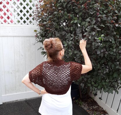 There is just enough metallic in this yarn to make this shoulder shrug shimmer. The elegant mesh, picot design will elevate any sleeveless top/tank or dress. It is a soft and lightweight fabrication. This pattern does not have any seams and includes 4 sizes. Sizes: S, M, L, XL. Yarn Weight: Fine Sport. Crochet Hooks: US G and US J