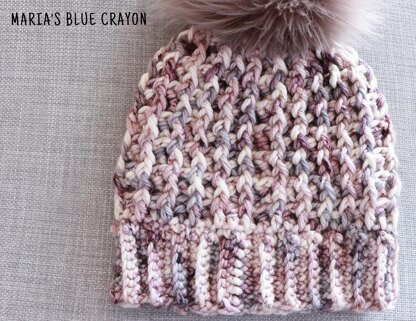 This crochet hat design is full of texture which makes this hat extra squishy and warm. Crocheted with a bottom up fashion, the hat has a snug fit from the brim and has shaping at the top that closes up nicely.
