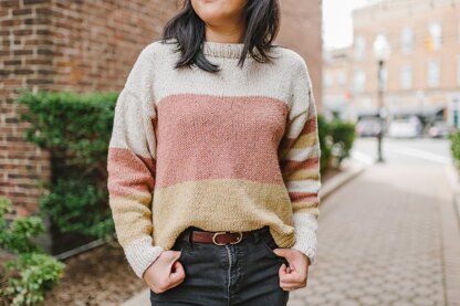 This simply constructed pullover features subtle side ribbing and mismatched sleeves. Work both sleeves at the same time to play with different color combos.