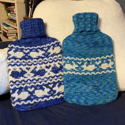 There’s nothing like a nice hot or cold water bottle to soothe an achy body. Even better if it has a soft, cute cover! This cover was designed with a beautiful hand-dyed Merino wool yarn and a handspun Merino/Angora yarn that will produce a nice, soft halo with use. The cover will fit a standard 2 liter classic rubber hot water bottle with a flat bottom commonly found in the US.