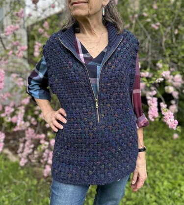 The Blue Harvest Vest takes its inspiration from the acres of blueberries harvested annually in Canada's Maritime provinces. The fields of ripening fruit dot the landscape throughout the summer in shades of blue and pink against a green backdrop.