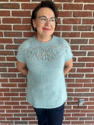 It’s knitted top-down with an A-line silhouette and features a lace insert.