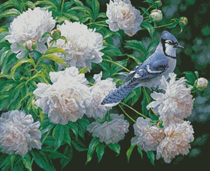 This counted cross stitch pattern of a Blue Jay in Peonies was created from a beautiful painting copyright of Beth Hoselton. Only full cross stitches are used in this pattern. It is a black and white symbol pattern. 77 DMC Colours are used. A smaller cropped version of this pattern is also available.