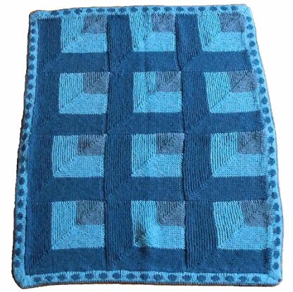 This pram blanket is knitted in a mixture of cotton and wool yarn. I have used 3 different blue shades. The blanket consists of 12 domino squares which are all knitted together. It is knitted on needles 4½mm. The blanket weighs about 260g. All kinds of yarn can be used as long as it fits needles 4½mm.The balls on the hem is knitted on both sides.