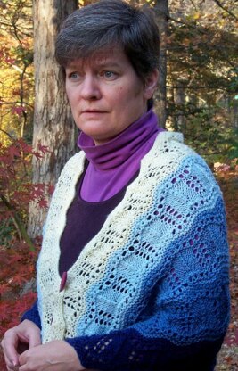 A simple pattern with enough change-ups to make it interesting and the beautifully shaded blues of the washable-worsted wool make this a shawl that is gorgeous and unique … and really fun to knit.