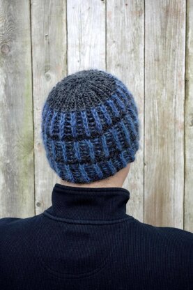 This super chunky hat features a two tone broken ribbed pattern, worked in round for a neat seamless and reversible look.