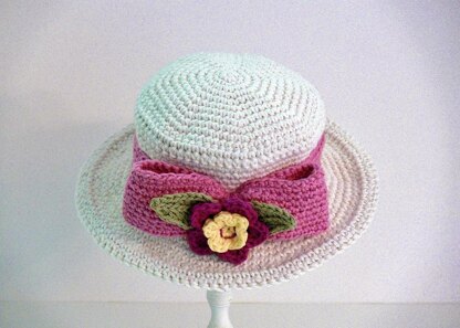 There are 2 patterns included. One is written in English using standard American terms and another is written in English using British terms.. Hat Bands, Flower and 2 Bows [ a single and a triple bow ] are also included. There are step by step instructions, color coded for sizes. The hat is mostly made in SC [ Double Crochet for Britain ] and uses Medium Worsted Weight yarn [ Aran for Britain, 10 Ply for Australia ] and a 4 mm crochet hook [ G/6 US - Britain 8 ].