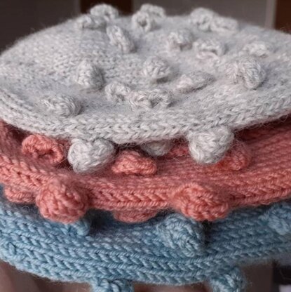 This pattern grew out of my love for knitting bonnets. It’s an easy design although the bobbles do take a little time because you knit back and forth. It’s knitted flat with ribbing for a snug fit. No seaming necessary as you use DPNs for the crown and pick up stitches for the neck. You can opt for i-cords or make a simple twisted cord for the ties.