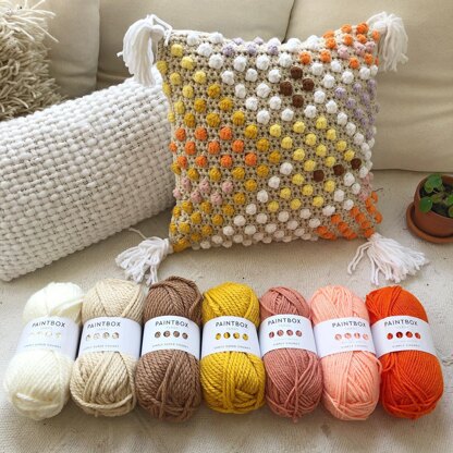 The Bobble Garden Cushion is made from Super Chunky/Bulky yarn in 8 colors. Specific colors pictured are listed in the pattern from Paintbox Yarns. There are tutorials on mu IGTV (@littlegoldennook) for crocheting contrast colored bobbles, and I've included step by step instructions for the corner tassels as well as a video on IGTV. The pattern also has a color chart to help you along.
