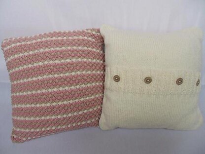 The photo shows the front and back views of the cushion which has a stripe bobble (blackberry) pattern to the front and a plain stocking stitch and rib back with four button fastening. The pattern also includes instructions for making just a plain stocking stitch front as an alternative.