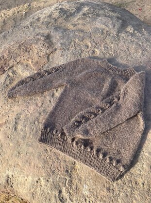 The neck is worked in the round with circular needle, from mid back and top down. Then divided for body and sleeves and the body is continued in the round with circular needle. The sleeves are worked with double pointed needles , or short needle , top down .