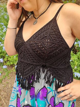 The Bohemia top is a very versatile garment that you can wear with trousers, skirts or dresses to give them a more original touch. If you want to make it longer, simply add more squares. It is knitted in pieces, each one knitted in a circular pattern. They are then sewn together and the straps are added. You can use circular needles or double-pointed needles.