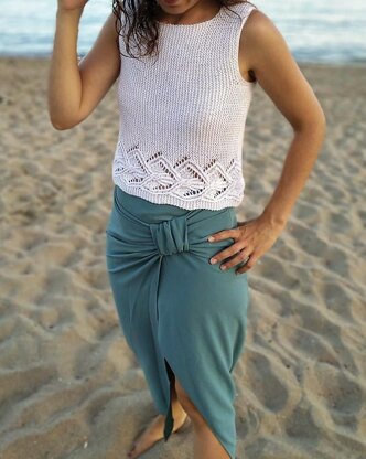 The top is knitted in one piece flat, starting on the left back and ending on the right back. It is knitted in the vertical direction. The top is divided into sections 1.1-1.7, as indicated in the diagram provided, depending on when it is time to bind off or cast on sts to shape the armhole, neck, sleeve, etc.