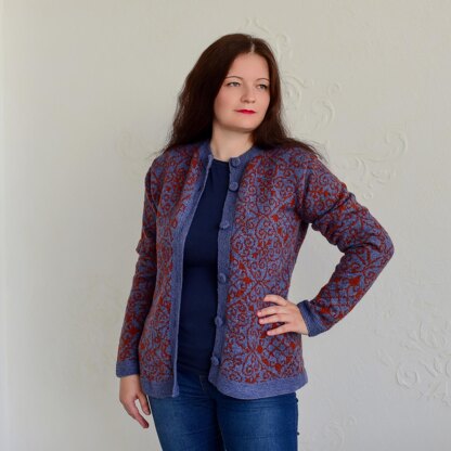 The body piece is knitted in one piece, without side seams. This jacket is straight, no fit. It is fastened with plastic buttons covered with the same knitted fabric.
