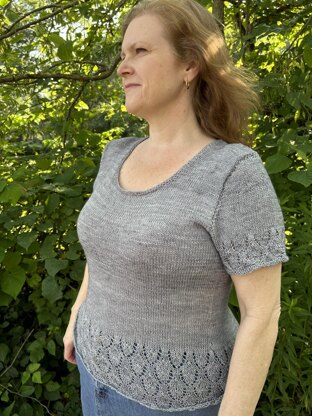 This top has a deep leafy lace hem and lace at the sleeves. This lacy top is made from a deliciously soft fingering weight yarn at a gauge larger than usually knit, so it’s great for spring through fall.