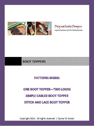 This 11 page eBook includes all three of my boot topper patterns: One Boot Topper-Two Looks, Simple Cabled Boot Topper, and Stitch & Lace Boot Topper. See the individual listings for descriptions of each boot topper.