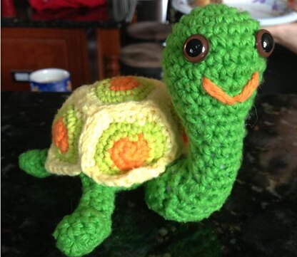 Bootes the Turtle is a friendly plushie that stands about 5 inches tall, 5 inches wide, and 4 inches deep (when stuffed). Pattern includes written instructions and a photo tutorial on construction of the turtle.