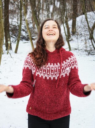 Bordova Hoodie is a soft, fluffy, slightly oversized, top-down seamless yoke sweater, with a hood. The sweater has short rows at the back of the neck to create a natural fit, and a stranded colourwork yoke featuring a contrast pattern with contemporary winter geometry. There is optional waist and hip shaping to add feminine shape, and the bottom hem and cuffs are finished off with ribbing. The hood is knit from the neckline upwards with short rows for shaping and a colourwork pattern up the back. An extra lining is added and then seamed inwards in order to house a knitted I-cord.